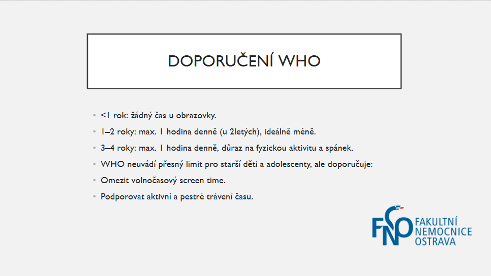 Uhlíř zároveň upozorňoval, že nepatří k těm, kteří chtějí démonizovat užívání digitálních technologií. Nicméně představený soupis možných následků je jasným varováním. Digitální závislost může způsobit řečové vady, problémy s pozorností či s pamětí, motorický neklid i zhoršení duševního zdraví. A u dětí má přímý vliv na fyzický stav. Jak pan doktor vysvětlil, především kvůli tomu, že mají dětské oči zvýšenou propustnost modrého světla a může dojít také k dlouhodobému tlaku na zaostřování oka. To s sebou pak přináší např. krátkozrakost nebo negativní dopady na spánek.